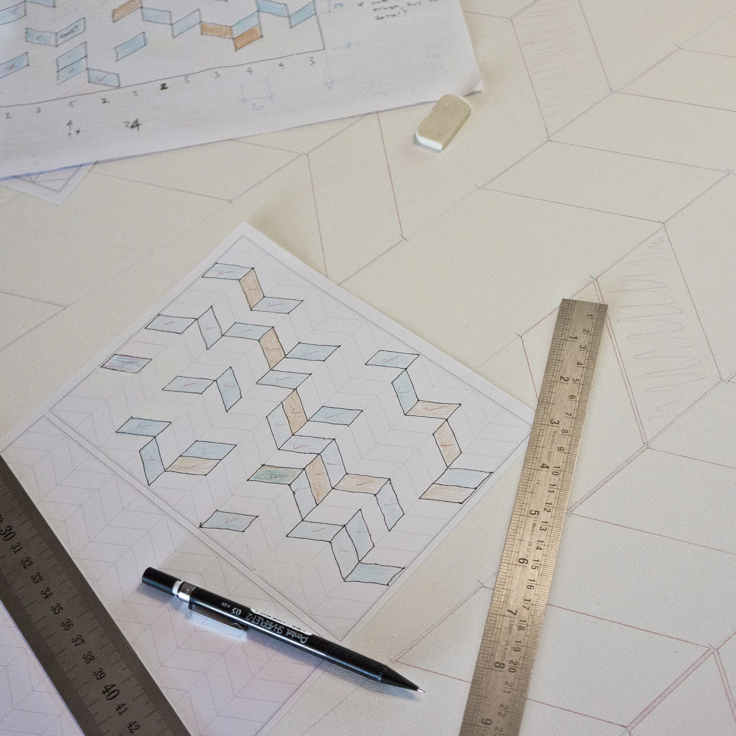 Preparatory sketch, and canvas being marked up, for "Chevron 2"